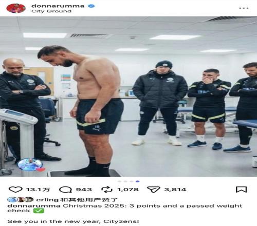 多納魯馬在社媒上表示:“2025年的圣誕節(jié),三分到手,體重檢測合格,明年再見了,城民們。”他同時(shí)發(fā)布了多張比賽照片,以及一張?jiān)诠系蠆W拉嚴(yán)格監(jiān)督下進(jìn)行稱重的畫面,顯示球隊(duì)在節(jié)日期間依然嚴(yán)格執(zhí)行體重管理制度。