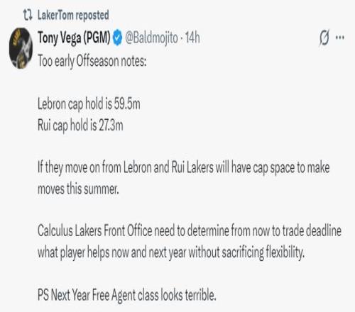 湖媒Tony Vega寫道:2026年夏詹姆斯可以釋放5950萬的空間,八村壘則可以釋放2730萬的空間,如果湖人不再留用詹姆斯、八村,那么湖人在2026年夏就有足夠的薪金空間來運作。