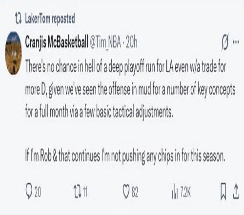 美媒CMB寫道:就算LAL交易得到更多防守球員我也不覺得他們能在季后賽中取得成果。因為過去一個月我發(fā)現(xiàn)這支湖人不僅是防守差,他們的進攻體系在多個關(guān)鍵方面都出現(xiàn)了嚴(yán)重的問題,而這些問題不是一些基礎(chǔ)的戰(zhàn)術(shù)調(diào)整就能改變的,如果我不是佩林卡,這些問題在交易截止日前解決不了,我是不會進行任何交易投入的。
