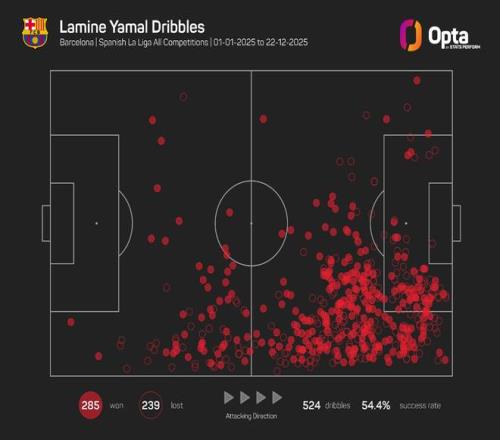 亞馬爾一共嘗試了524次過人,成功285次,過人成功率達到54.4%。此外,亞馬爾的過人基本都在他所處的右邊路完成。