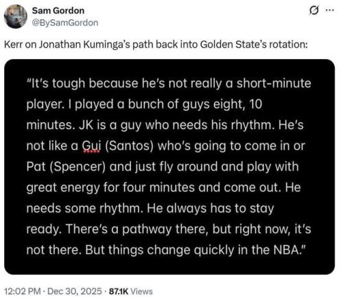 這樣一來(lái),12月份勇士隊(duì)12場(chǎng)比賽中,庫(kù)明加被DNP8場(chǎng),僅獲得4場(chǎng)登場(chǎng)機(jī)會(huì)。