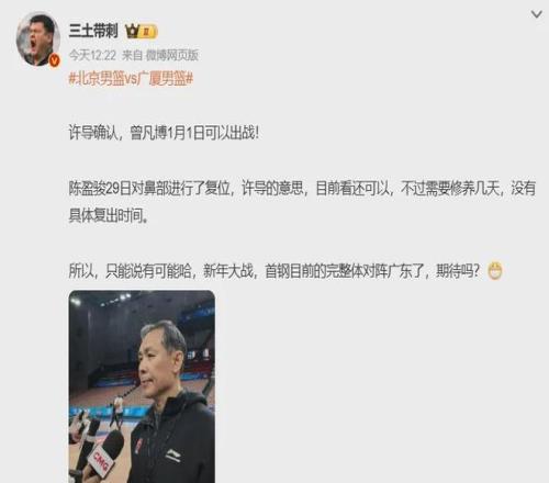 幾乎與此同時(shí),北京隊(duì)主帥許利民確認(rèn)曾凡博會出戰(zhàn)北京時(shí)間2026年1月1日北京隊(duì)主場VS廣東隊(duì)的新年大戰(zhàn),這是他的本賽季首秀。