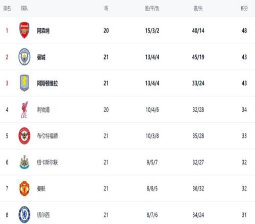在積分榜上,曼聯(lián)和阿斯頓維拉紛紛丟分,讓阿森納賺大了。阿森納總積分是48分。曼城和阿斯頓維拉都是43分。阿森納領(lǐng)先5分,而且還是少賽一場(chǎng)。如果阿森納接下來能夠擊敗利物浦,將把優(yōu)勢(shì)擴(kuò)大到8分。利物浦目前34分,排名第4。布倫特福德以33分排名第5。紐卡斯?fàn)柭?lián)和曼聯(lián)都是32分。