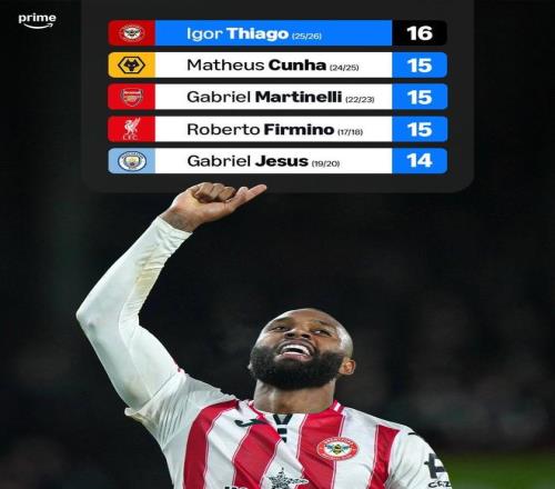 至此,伊戈?duì)?蒂亞戈本賽季代表布倫特福德在英超出場(chǎng)21次已打入16球。