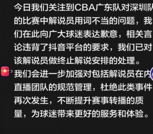 果然也有了效果,賽后某音平臺官方道歉,對于該解說員予以終止解說的安排,并要求會進(jìn)一步加強(qiáng)對包括解說員在內(nèi)直播團(tuán)隊(duì)的規(guī)范管理,杜絕此類事件再次發(fā)生,不斷提升賽事轉(zhuǎn)播的質(zhì)量,為球迷帶來更好的服務(wù)和體驗(yàn)。