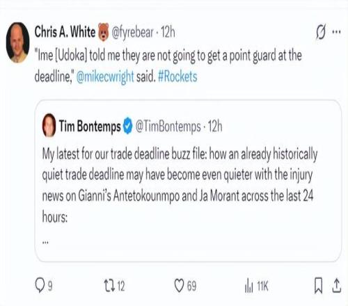 但火箭隊(duì)記克里斯-懷特轉(zhuǎn)推后回復(fù):烏度卡告訴我,在本賽季交易截止日前他們不考慮引進(jìn)一個(gè)控球后衛(wèi)。