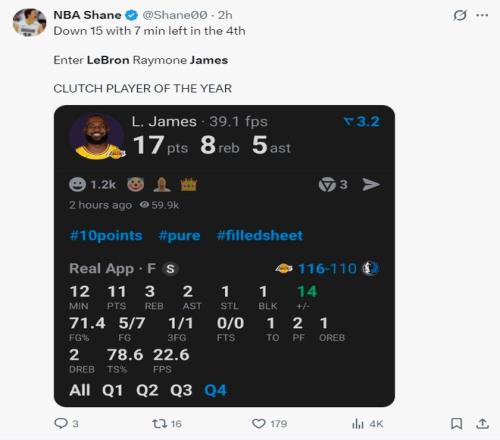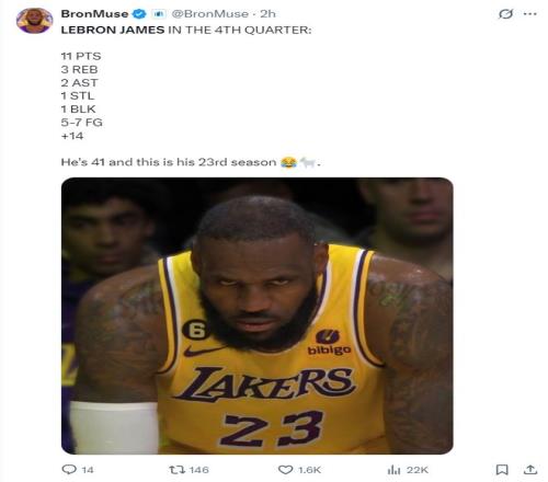 末節(jié)勒布朗打滿了12分鐘,7中5,三分1中1,在沒(méi)有罰球的情況下拿到11分3籃板2助攻1搶斷1蓋帽,正負(fù)值+14,這里面還有一個(gè)切球沒(méi)有算在數(shù)據(jù)內(nèi),湖媒盛贊41歲征戰(zhàn)第23個(gè)賽季的老頭子為GOAT。