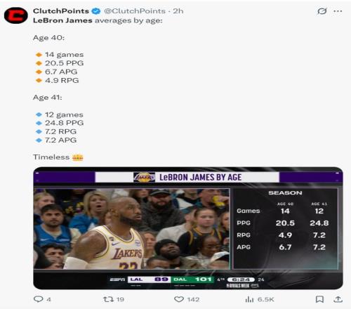轉(zhuǎn)播方也還出,詹姆斯40歲的14場(chǎng)比賽場(chǎng)均20.5分6.7籃板4.9助攻,但41歲的12場(chǎng)比賽場(chǎng)均24.8分7.2籃板7.2助攻,老詹還在進(jìn)步。